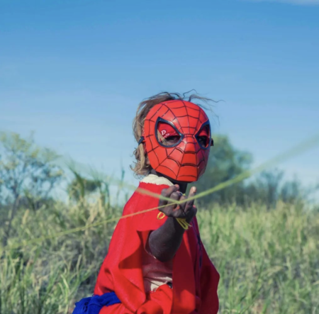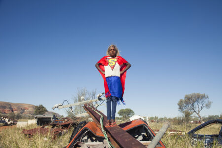 Tony Albert, David C Collins and Brittany Malbunka Reid Warakurna Superheroes #6, 2017 archival pigment print on paper 100 x 150 cm Edition of 3 plus 2 artist's proofs