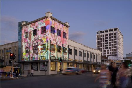 Valley Walkabout , 2022 Architectural Projection Commissioned by Outer Space Judith Wright Facade, installation view